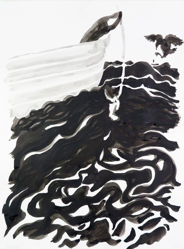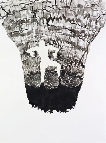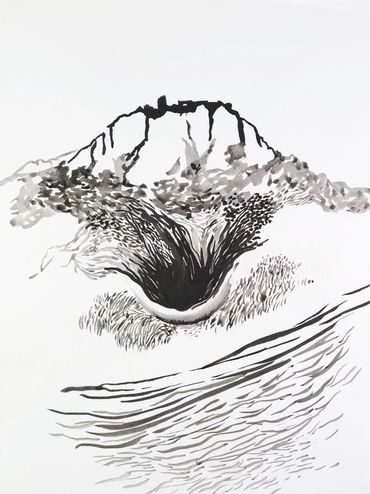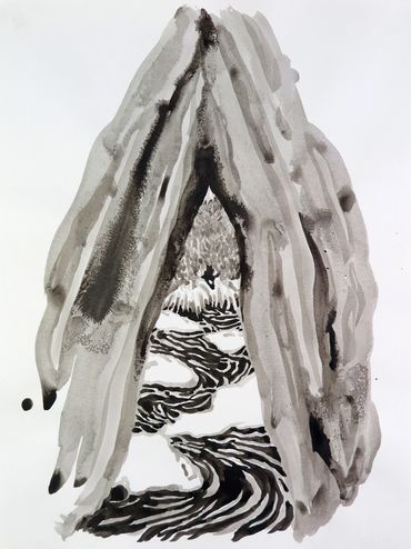 Hook, 2016, india ink on paper, 20 x 15"; Caves Unto Caves, 2016, india ink on paper, 20 x 15"