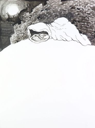 Arrival, 2016, india ink on paper, 20 x 15"; The Depths of the Ruins Know, 2016, india ink on paper, 20 x 15"; Nightmare in the Womb, 2016, india ink on paper, 20 x 15"